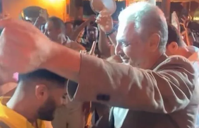 وهو يرقص مع العروسين بحيوية ونشاط، كما حرصت بعض الفنانات على الرقص مع العروسين منهم لقاء سويدان ولقاء الخميسي وداليا البحيري وغيرهم