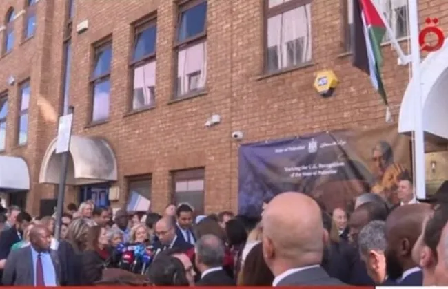 شهدت العاصمة البريطانية لندن، رفع العلم الفلسطيني على مبنى البعثة الفلسطينية، وذلك فى