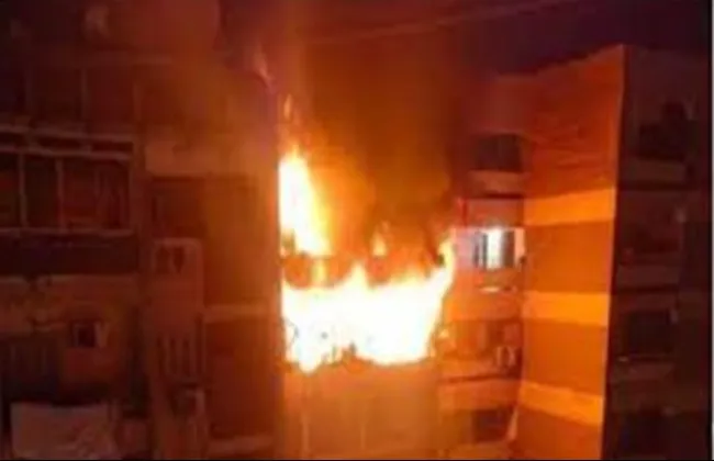 والأجهزة الأمنية إخطار يفيد بنشوب حريق هائل داخل شقة سكنية خالية من السكان بالطابق التاسع