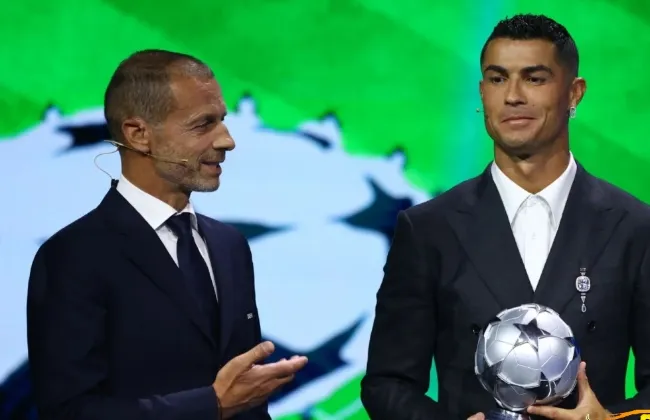 وتسلم كريستيانو رونالدو، جائزة الهداف التاريخي لدوري أبطال أوروبا، من ألكسندر تشيفرين رئيس الاتحاد الأوروبي