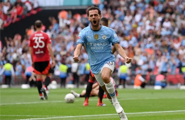 ورد البرتغالي برناردو سيلفا برأسية للسيتي في الدقيقة 15، لكن تعلو قائم لامينس ....