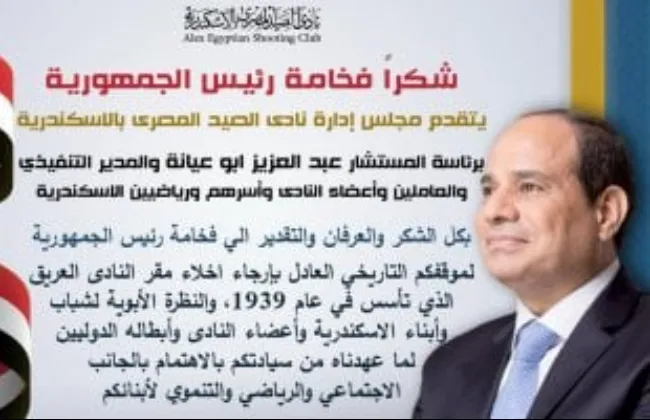 تقدم مجلس إدارة نادي الصيد المصري بالإسكندرية، برئاسة المستشار عبد العزيز أبو عيانة، بالشكر والعرفان إلى رئيس الجمهورية عبدالفتاح السيسي، لدعمه التاريخي العادل