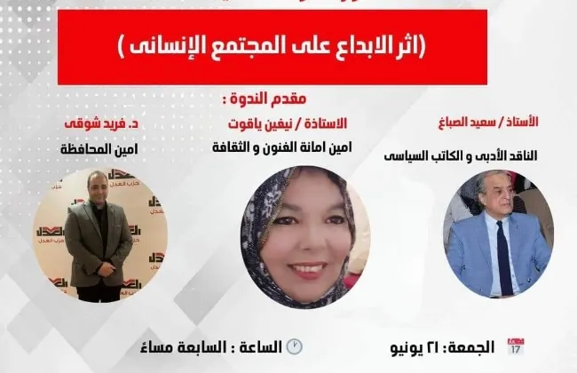 وقد ألقى الندوة الناقد الأدبي والكاتب السياسي سعيد الصباغ، وأدارتها الكاتبة نيفين ياقوت، أمين الثقافة والإبداع بحزب العدل بالإسكندرية، بحضور الدكتور معتز الشناوي المتحدث الرسمي باسم الحزب، إلى جانب لفيف من القيادات الحزبية والمهتمين بالعمل العام.
