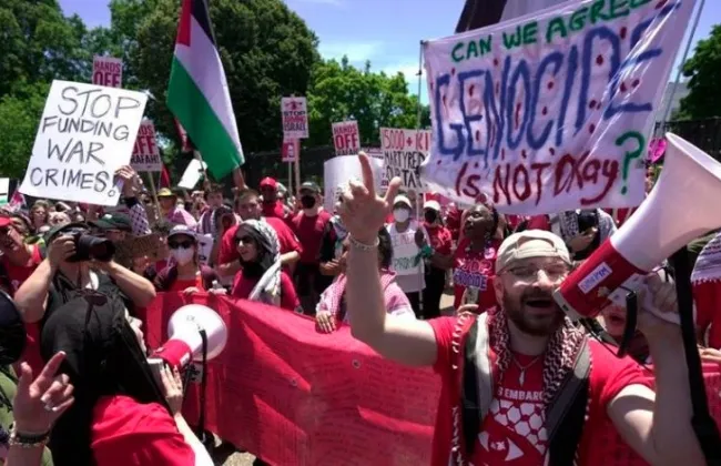وبحسب ما ذكرت صحيفة نيويورك تايمز، فقد حمل المتظاهرون لافتات تصف بايدن بالكذاب، وظهر أغلب المتظاهرين بألوان العلم الفلسطيني الأحمر والأخضر، وساروا نحو المنطقة ....