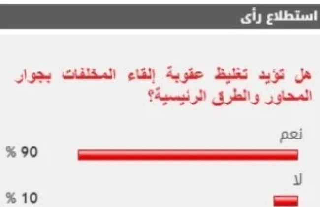 ٩٠٪ من القراء يؤيدون تغليظ عقوبة إلقاء المخلفات بجوار المحاور والطرق