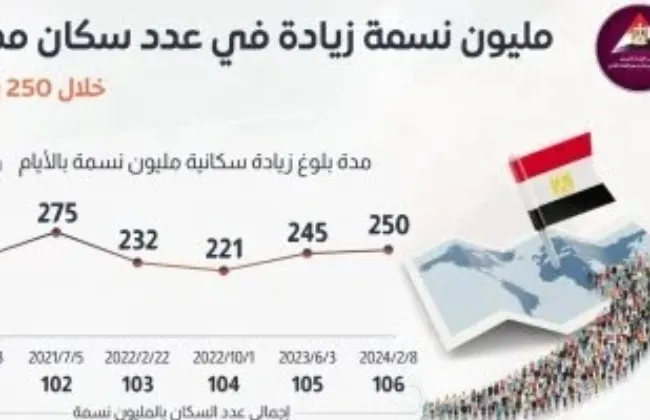 حتى 8 فبراير 2024، بزيادة مليون نسمة في خلال 250 يومًا