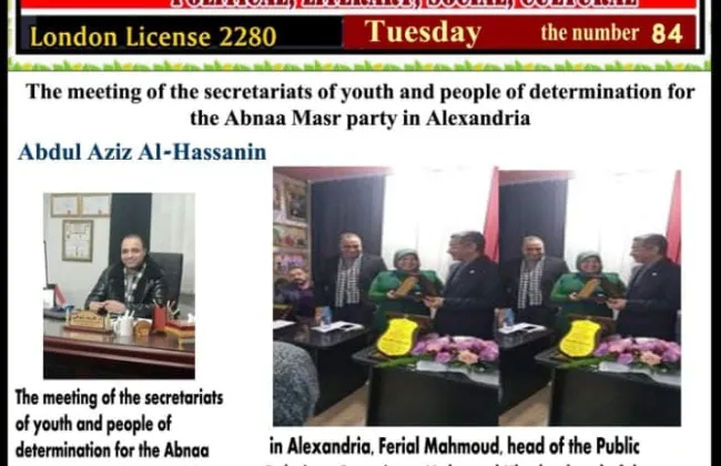 في تغطية دولية لافتة، نشرت جريدة Al Shahla Literary Newspaper الصادرة في لندن، في عددها رقم (84) ليوم الثلاثاء، تقريرًا موسعًا عن الفعاليات السياسية والتنظيمية التي تشهدها مدينة الإسكندرية، مشيرة إلى اجتماع قيادي حضره الدكتور فريد شوقي، أمين عام حزب العدل بمحافظة الإسكندرية، ضمن جهود مكثفة تستهدف تمكين الشباب ودمج ذوي الهمم في العمل العام.
