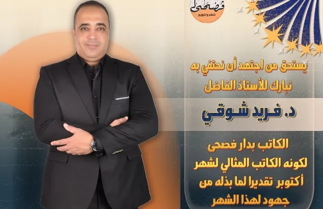 في خطوة تؤكد التزامها بدعم الأدب العربي الرصين ونشره عالميًا، أعلنت دار فُصحى للنشر والتوزيع عن اختيار الكاتب والأكاديمي البارز الدكتور فريد شوقي ليكون "الكاتب المثالي لشهر أكتوبر".