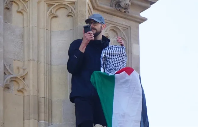 شخص يتسلق برج ساعة بيج بن وسط لندن ويرفع علم فلسطين