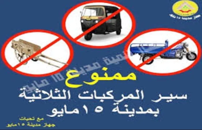 قرر جهاز مدينة 15 مايو منع سير التروسيكل داخل شوارع المدينة، وذلك لأول مرة منذ قرار إنشاء المدينة