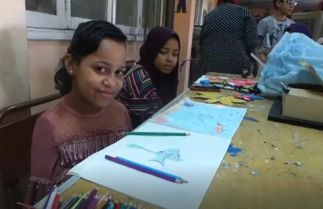 وجلست بسملة طفلة أسوان، على كرسي لها وأمامها منضدة فوقها مجموعة من الألوان وورقة بيضاء، ثم بدأت تلتقط بأسنانها القلم الرصاص وتخط به في الورقة حتى انتهت برسمة وردة وشجرة خضراء لونتها ....